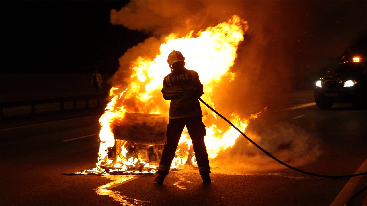 A fire breaks out. A man and his young daughter, Laura, are trapped by the flames.